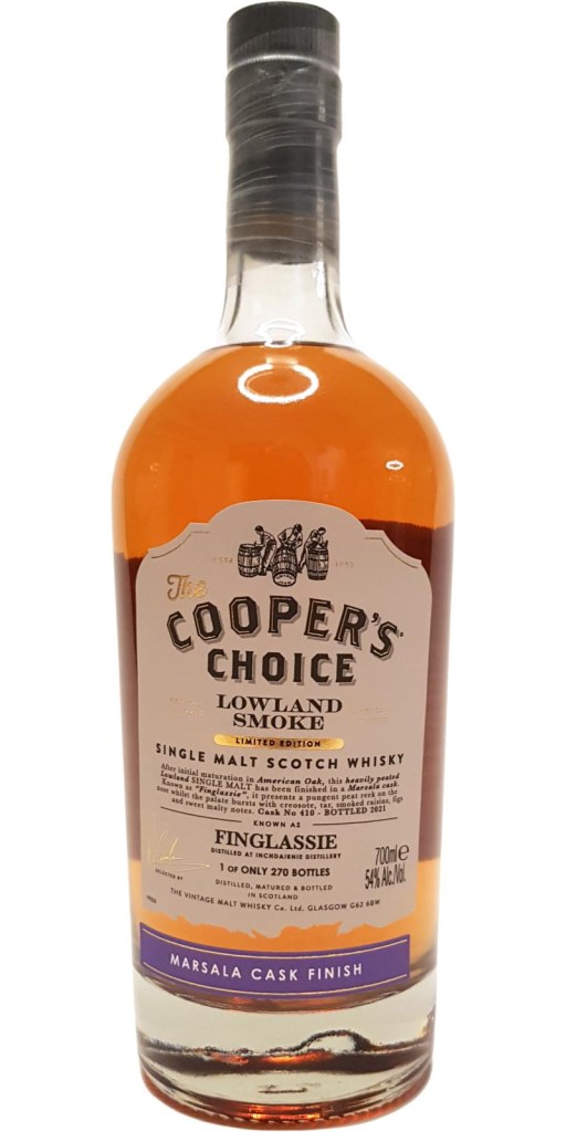 This Finglassie is a heavily peated version of their distillate, and it’s not the only one from Cooper’s Choice. There are two other ones that are also finished in wine casks. One in a Madeira and the other in a Sauternes cask.